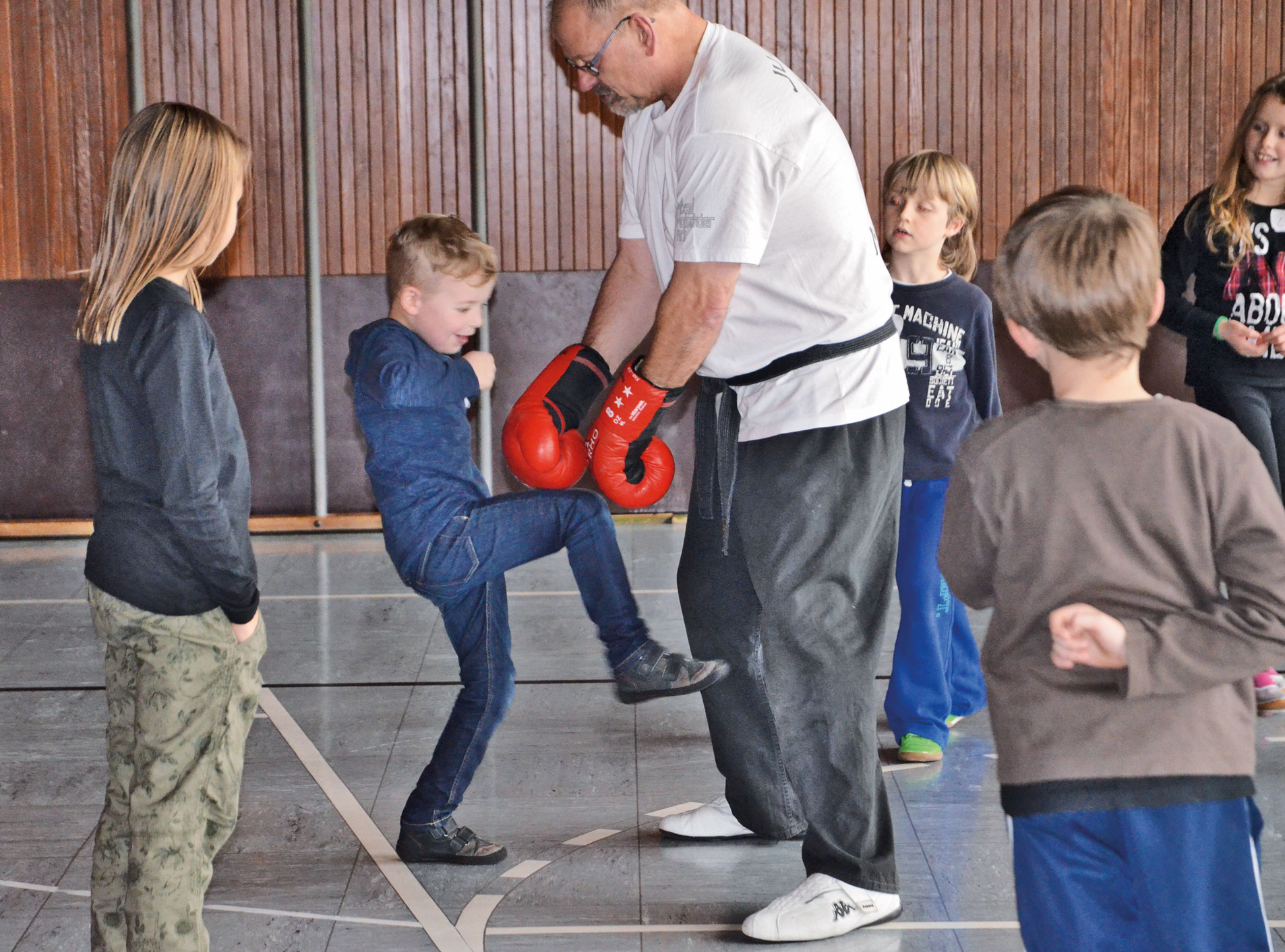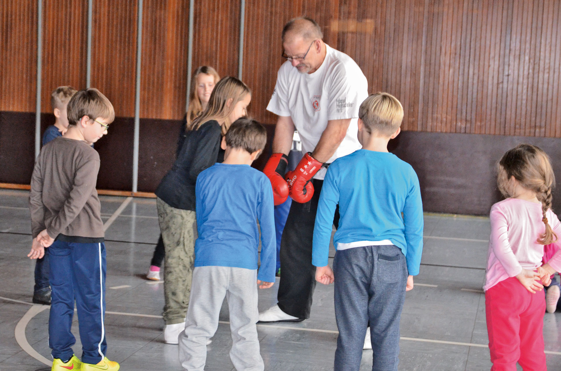 Zunächst zeigte der Sozialpädagoge Situationen, die vorkommen können, beispielsweise wie man erkennt, ob ein Kind ein leichtes Opfer ist. Aufrechter Gang, Blick nach vorne, das schreckt potentielle Täter ab. Bei den Abwehrübungen wurden verschiedene Möglichkeiten aufgezeigt, jedes Kind durfte mehrmals üben, damit es im Falle der Gefahr auch richtig reagiert. Die Abwehrübungen seien aber nur für den Fall der Notwehr anzuwenden, nicht im Schulhof gegenüber Mitschülern. Auch das Verhalten eines Kindes am Telefon, wenn es alleine ist, wurde durchgesprochen. Ein weiteres Beispiel: Wie verhält man sich, wenn Minderjährige von fremden oder bekannten Personen angesprochen und zum Mitkommen aufgefordert werden? Niemals sollte ein Kind fremden oder auch bekannten Personen folgen, auch wenn noch so attraktive Geschenke angeboten würden, und schon gar nicht, wenn sie aufgefordert würden, das „Geheimnis“ für sich zu behalten. Nur, wenn die Eltern darüber informiert sind, wo ihr Nachwuchs hingeht, und das auch der Täter weiß, kann Gefahr minimiert werden. Wenn bei Belästigung eines Kindes gerade niemand als Ansprechpartner da sei, sollte es das nächste Geschäft aufsuchen und Hilfe erbitten.