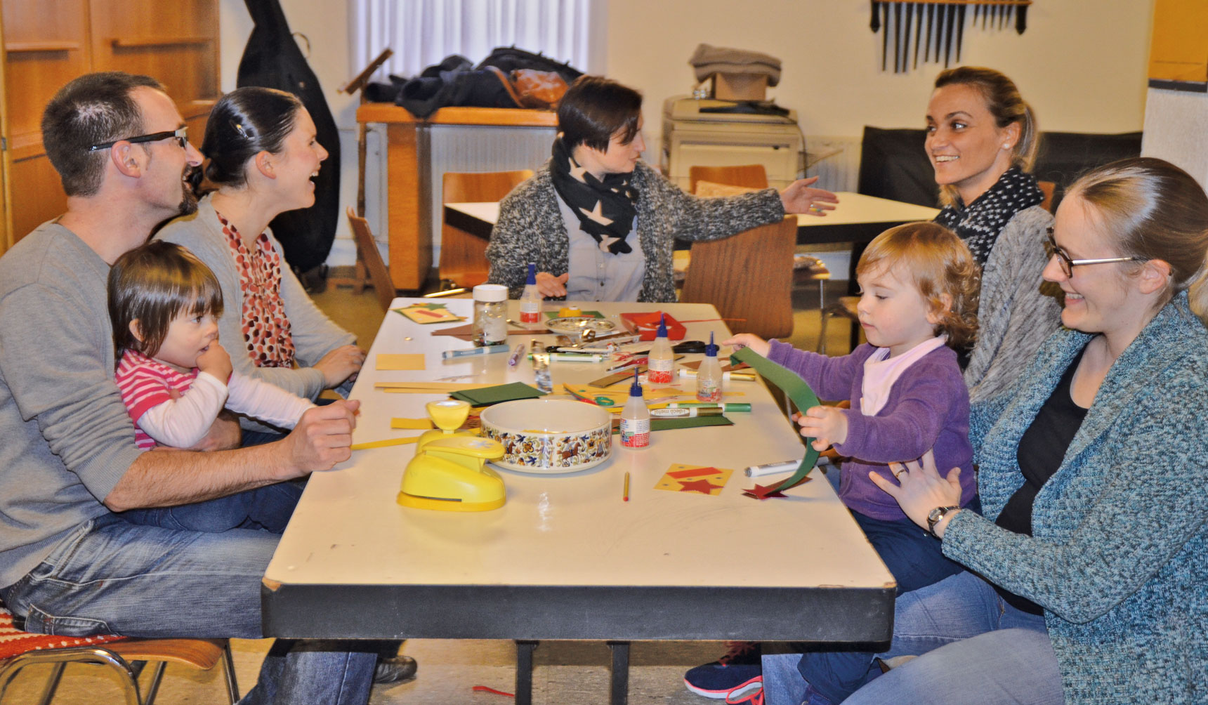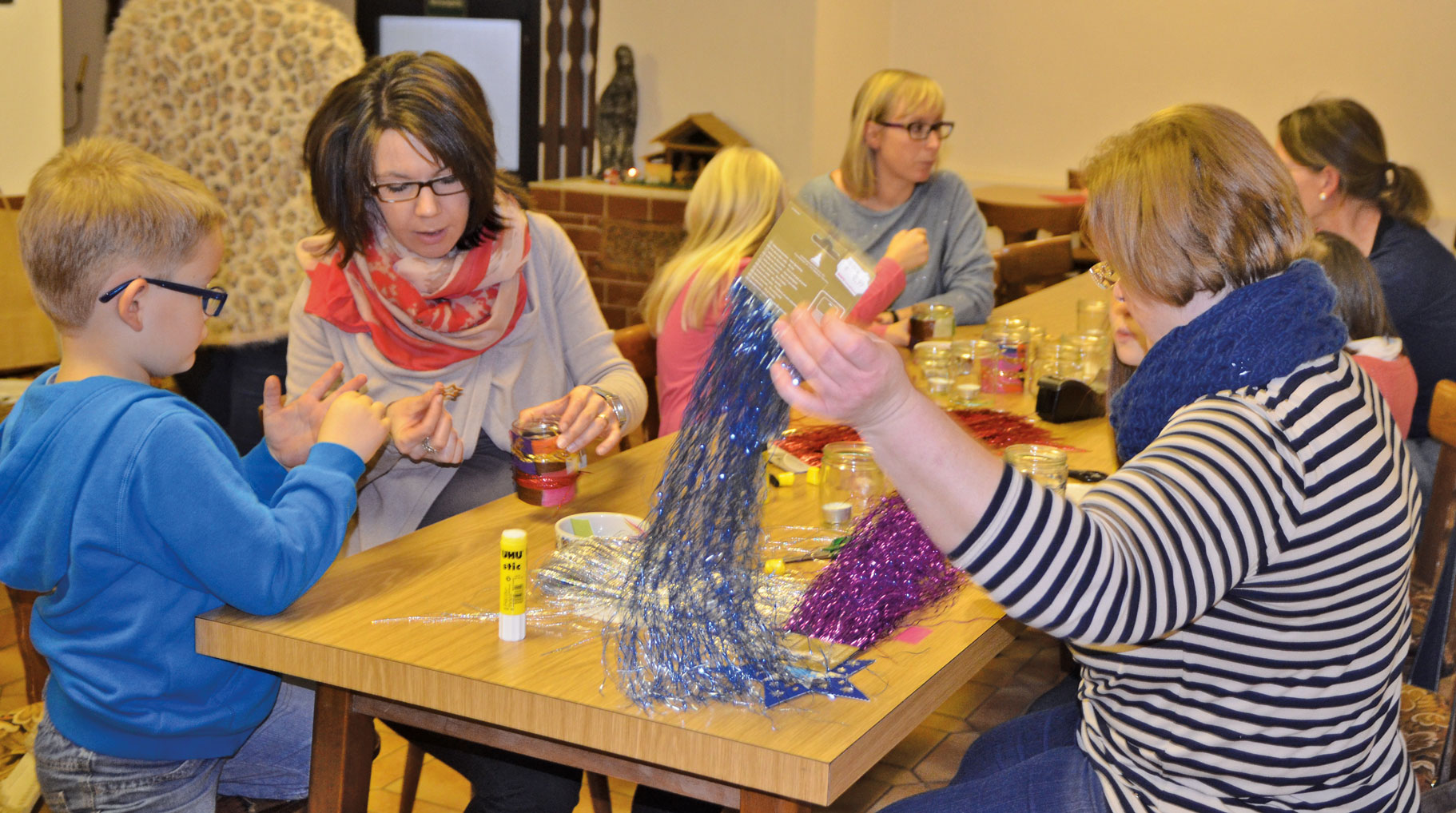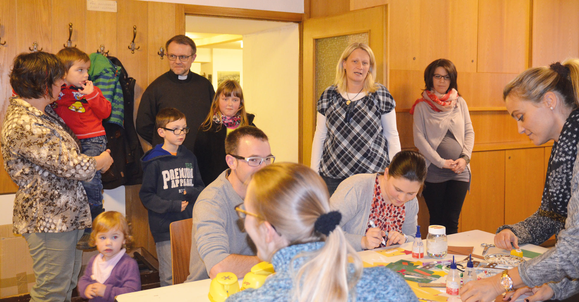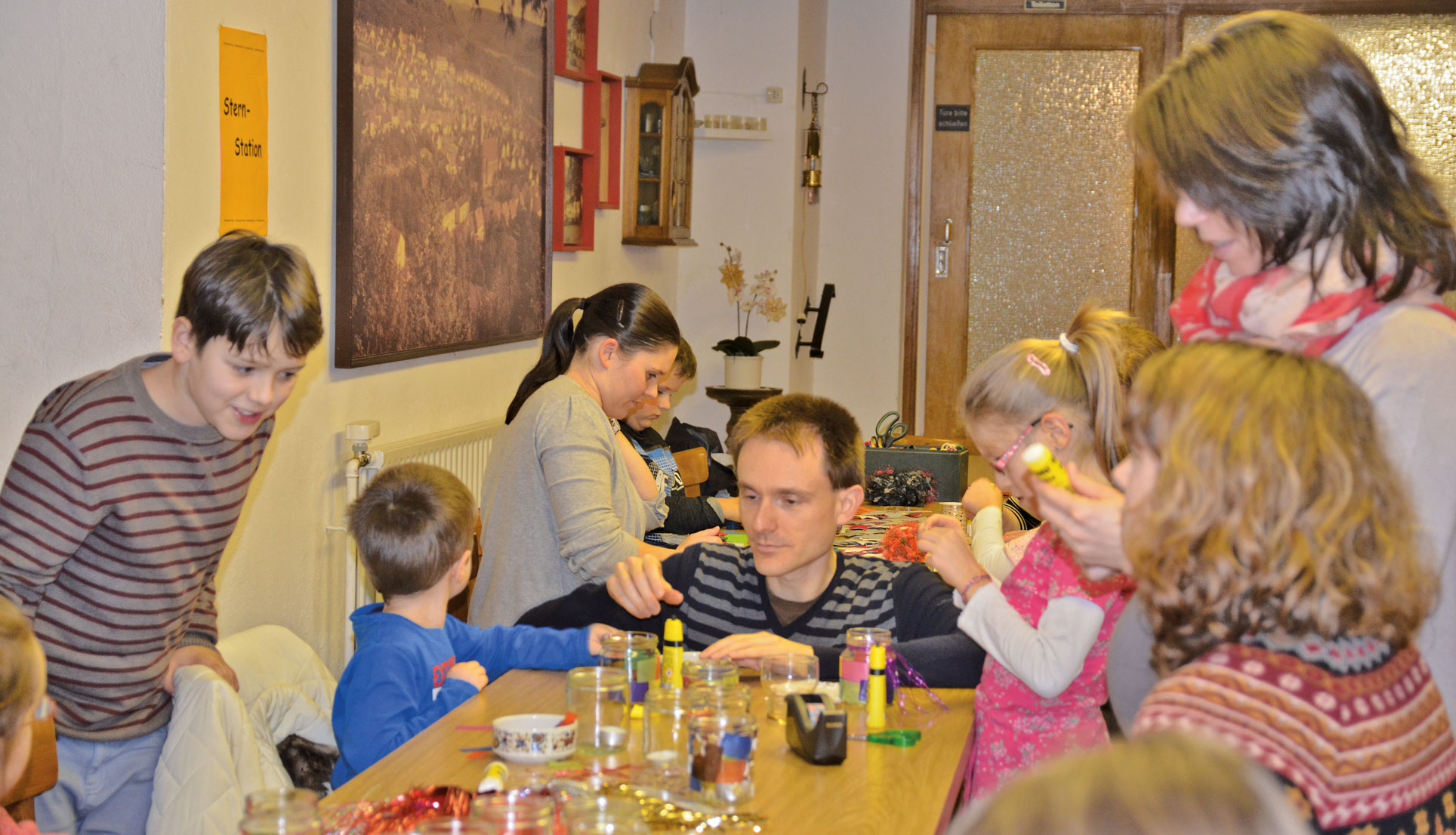 An fünf Stationen zum Basteln wurde das Thema Licht von den Kindern umgesetzt: Ein Windlicht, ein Stern, eine Karte und eine Kerze aus Süßigkeiten wurden gestaltet, an der Gemeinschaftsstation konnte man auf einer groß gemalten Kerze seinen farbigen Händedruck verewigen. Der krönende Abschluss war der Gottesdienst, für den die Kinder der Kita Herz Jesu mit ihrer Leiterin Nina Rambaud eine Geschichte, realisiert durch ein Spiel, vorbereitet hatten. Es wurde aber nicht nur gemeinsam gebastelt, sondern in Gesprächen konnte man sich austauschen.