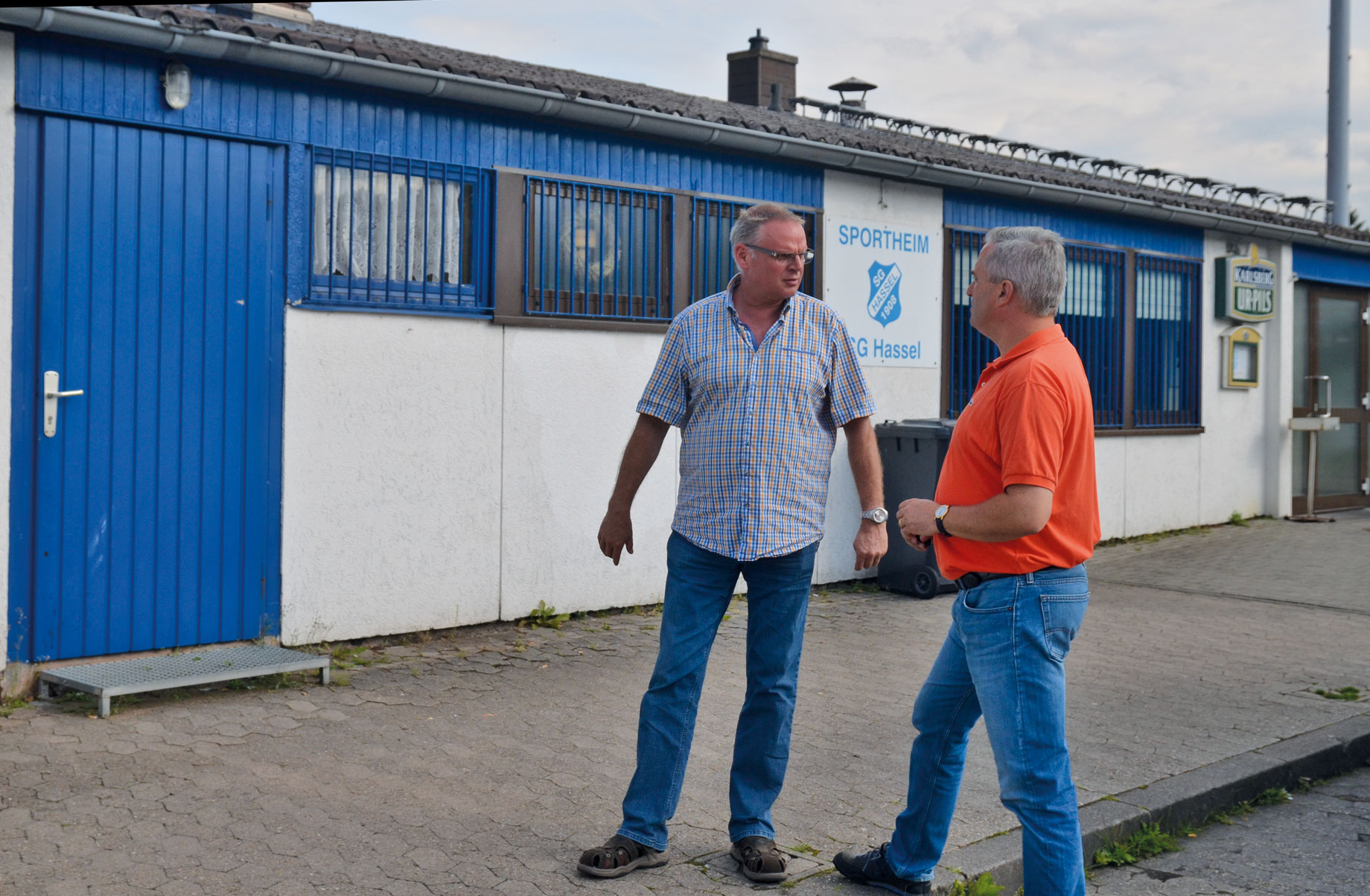 Ausgangspunkt war das Sportheim der Sportgemeinde Hassel, dessen Duschtrakt saniert werden soll. Die Finanzierung ist gesichert, nach Information des Ortsvorstehers soll noch dieses Jahr damit begonnen werden. Was noch fehlt, ist eine behindertengerechte Toilette. Hier bietet sich, so Ortsvorsteher Hauck, ein Standort hinter der Eisenberghalle an, der eine Benutzung sowohl von Besuchern der Eisenberghalle als auch den Zuschauern bei Fußballspielen ermöglichen würde. Des Weiteren ist die aus dem siebziger Jahren stammende Eingangstür der Eisenberghalle in die Jahre gekommen und müsste ersetzt werden“, so Markus Hauck.