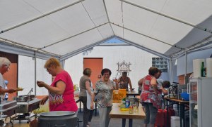 Glück bis zum Schluss hatten die Helfer und Gäste des Gemeindefestes an Fronleichnam, denn pünktlich um 17 Uhr (Ende des Festes) kam das Gewitter.Schließlich soll der Erlös für den Neubau Kita Herz Jesu gespendet werden. Land, Kreis und Stadtrat haben zwar das Projekt unterstützt, aber das reicht noch nicht, um anfangen zu können. Es fehlt noch eine nicht geringe Summe. Beispielsweise ist der Aufzug des zweistöckigen Gebäudes nicht förderfähig lt. Ministerium für Bildung und Kultur, obwohl zwei Kinder mit Rollstuhl (Inklusion) die Kita besuchen.