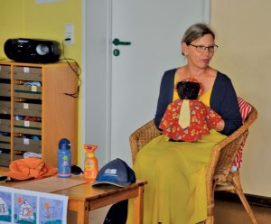 Veronika Schomas, von den Kindern Frau Sonne genannt, führte das Projekt durch. Zunächst wurden Eltern und Erzieherinnen informiert und neben Leiterin Nina Rambaud erklärte sich als Sonnenschutzbeauftragte Nina Feist bereit. „Es ist wichtig, dass man schon früh anfängt und den Kindern spielerisch verdeutlicht, warum und wann sie sich vor Sonne mit Sonnencreme und Sonnenhut schützen sollen. Es ist auch wichtig, dass das Eincremen zum täglichen Ritual bei entsprechendem Wetter wird, das steigert den Lerneffekt“. Es wurden bestimmte Sonnenschutzregeln aufgestellt, die es einzuhalten galt, das richtige Eincremen vorgestellt und den Eltern eine Broschüre anhand gegeben. Mit Hilfe einer Puppe, die verwandelbar war und verschiedene Kopfbedeckung und Kleidung trug, einmal Lisa, dann Seppl oder Lucie hieß, begeisterte Frau Sonne die Kids in der Kita, vom Krippenkind bis zum Vorschulkind. Der pädagogische Ansatz gelang. Am Eingang der Kita hatte Nina Feist jeden Tag den UV-Index ausgehängt. So wussten die Kleinen, welcher Schutz angebracht war. Sie nahmen jeden Tag ihre eigene Sonnencreme mit, natürlich auch ihre Kopfbedeckung, cremten sich mit Hilfe der Erzieherinnen ein, wenn sie draußen spielten, halfen sogar den Krippenkindern und erinnerten daran, wenn jemand sich nicht eingecremt hatte. Die Kids überprüften auch, ob die Erzieherinnen ihren Sonnenhut trugen und eingecremt waren, wenn nicht, gab es eine Ermahnung; hier kam den Kindergärtnerinnen eine Vorbildfunktion zu.