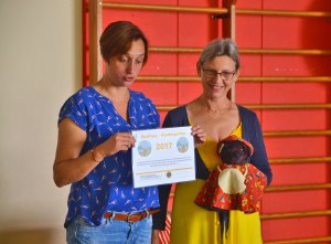 Nun kam Frau Sonne wieder, um zu überprüfen, ob die Kids und ihre Kita das Zertifikat für „aktive Bemühungen im Sonnenschutz“ bekommen können. Fragen waren: Wann darf ich nur im Schatten spielen und wann soll ich zwischen 11 und 16 Uhr nicht in die Sonne gehen? Wann muss ich mich eincremen und welche Kopfbedeckung hilft mir? Dazu gehörte auch das Verhalten im Urlaub am Strand. Auf dem Tisch der Frau Sonne waren Sonnencremes, Sonnenbrille und verschiedene Kopfbedeckungen ausgebreitet, mit deren Hilfe sie zeigte, wie man Augen, Kopf und Haut vor schädlichen Sonnenstrahlen schützt. Mit Bravour und Begeisterung bestanden die Kinder ihre Prüfung, antworteten sogar, wenn die Frage noch nicht richtig ausgesprochen war. Deshalb bekam die Kita bekam das Zertifikat „Sonnengeschützter Kindergarten“.