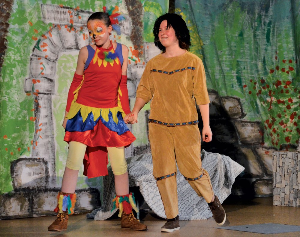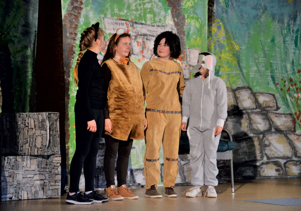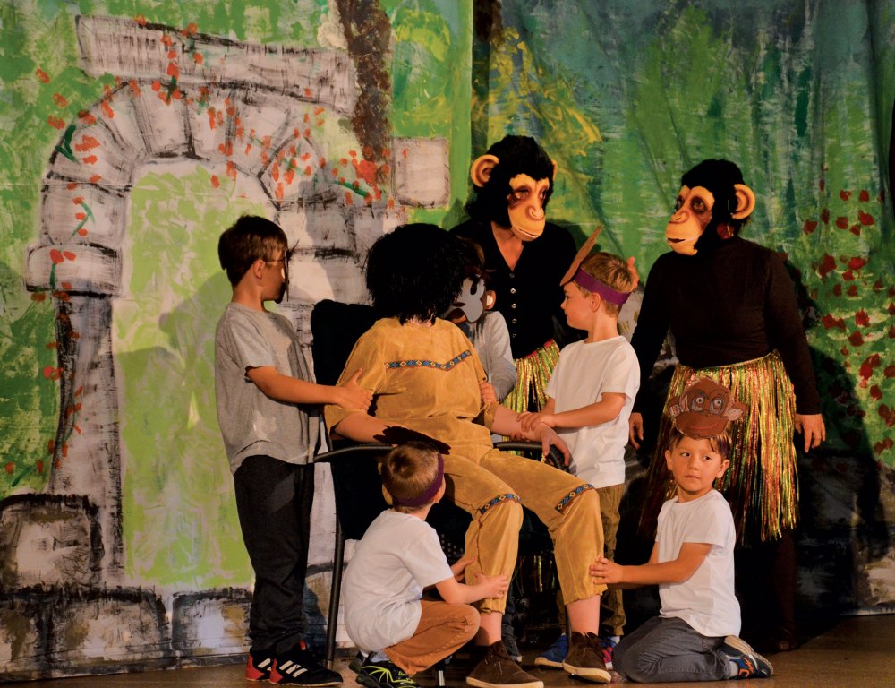 Das Menschenkind Mowgli, das in den Dschungel verschlagen, von den Wölfen, Balou und Baghira beschützt und mit den Gesetzen des Dschungels vertraut gemacht wurde, entschied sich zum Schluss, bei seinen Freunden im Dschungel zu bleiben. Viel Applaus ernteten auch Monika Hauptmann-Kartes und Johanna Baumgarten als Affenmann und Affenfrau, ebenso die Geier (Lena Burgei, Alina Zimmer), der Papagei (Frida Esser) sowie die Elefanten unter der Führung von Hanna Kunz und Lucy Zimmer. Der Tiger Sher Khan (Chiara Beck) wurde nicht getötet wie im Original von Rudyard Kipling, sondern nur vertrieben, zum Schluss siegte das Gute.