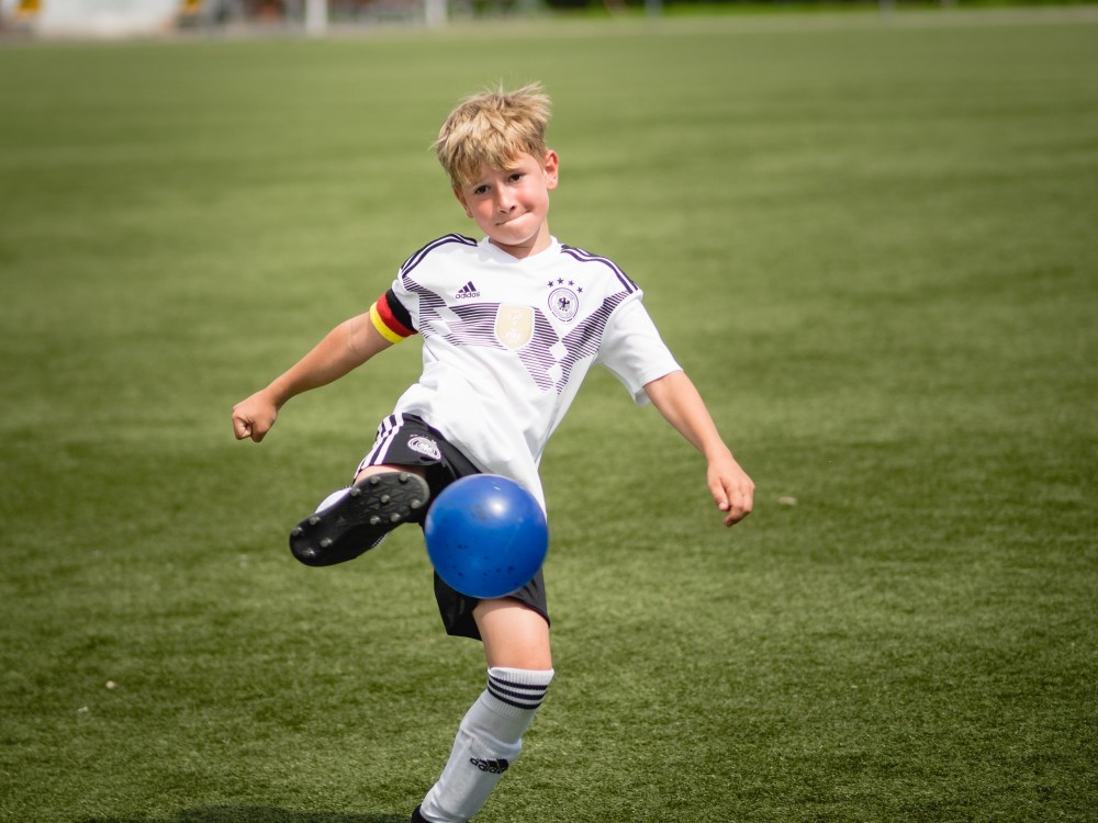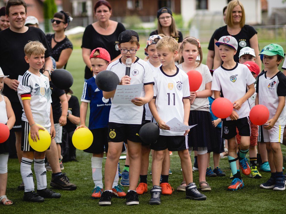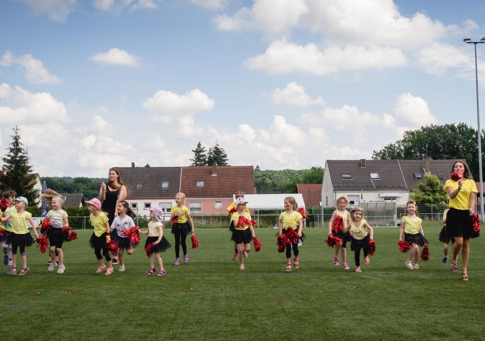 Damit die XXL-Bälle auch motiviert trotz hoher Temperaturen über die Mini-Felder in verschiedenen Altersklassen rollen konnten, bedurfte es natürlich noch eine Extra-Portion Motivation. Die Hortis hatten ein eigenes Sonnenblumen-Turnier-Lied getextet – „Heute feiern wir Sommerfest, dam, dam, die Sonnenblume feiert bunt, jetzt geht’s richtig rund“ – und die Kindergarten-Mädels sorgten mit glänzenden Pompons in ihren einheitlichen Kostümen mit Flatterröcken nicht nur für Farbtupfer in schwarz-rot-gold, sondern vor allem auch für jede Menge Schwung und gute Laune mit einer liebevoll einstudierten Choreographie. Alle Kinder der ev. Kita Sonnenblume von Krippenalter bis Viertklässler sangen zum Abschluss der Einführung noch das Lied „Fußball, ich spiel Farbtupfer“!