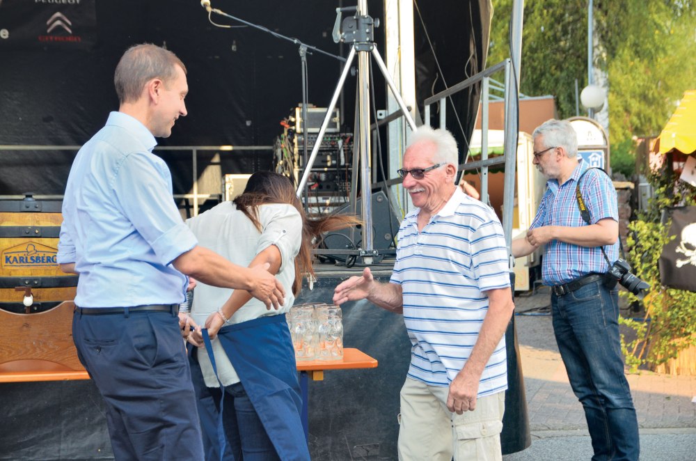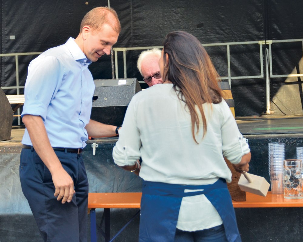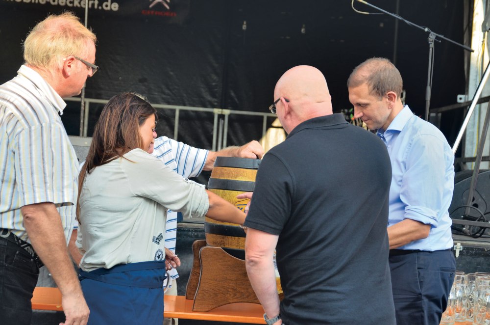 Nach der Begrüßung der Gäste durch Ortsvorsteher Markus Hauck schlug Bürgermeisterin Nadine Müller gekonnt mit dem Staatssekretär für Finanzen, Ulli Meyer, das von Firma Braun gespendete Fass an. Bert Zitt assistierte dabei. Fotos: Christa Strobel