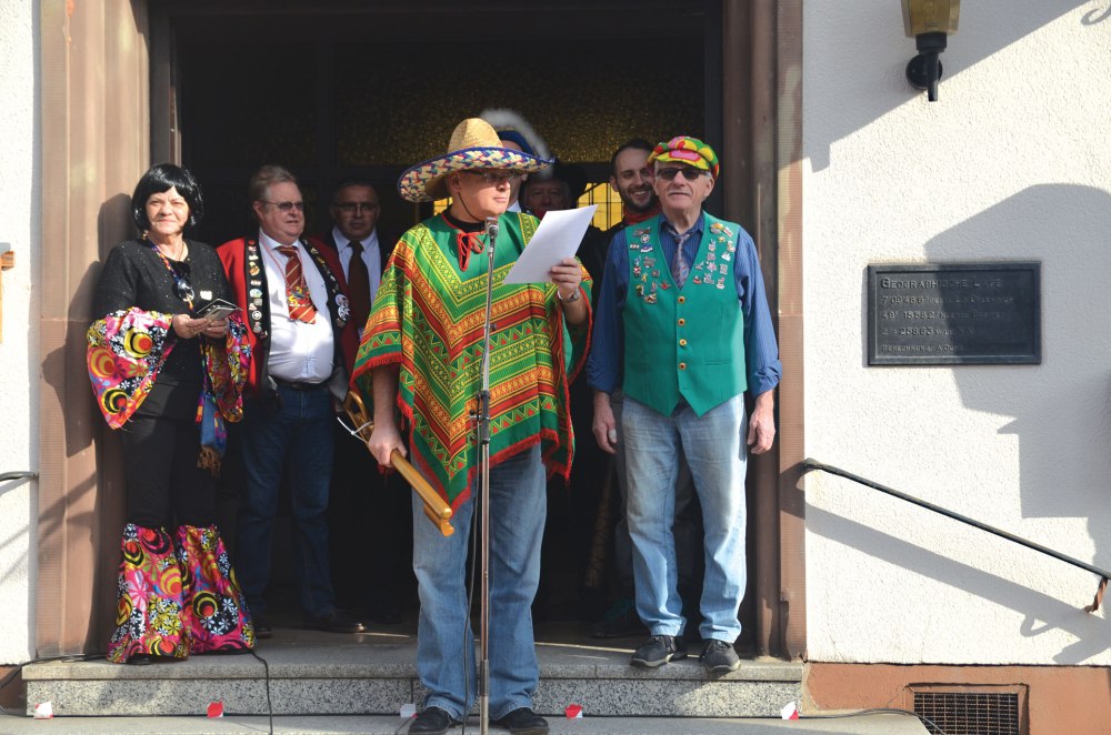 Um 10:11 war es so weit. In Hassel begann die Vorgeschichte zur Rathauserstürmung. Die Kita Sonnenblume, die Hasseler Frauen, die gerne miterleben wollen, wie der Ortsvorsteher entmachtet wird, und die Kinder- und Jugend-Garde des KCH (es waren ja dieses Jahr Ferien) konnte erstmals dabei sein. Natürlich fehlten die Ata-Girls nicht, mit ihren Staubwedeln und Klo-Bürsten, die Susi Vicentini vom KCH, die jedes Jahr die Rede hält, unterstützten. Zunächst musste der „Ortsforts“ die Männer ans Rathaustor rufen. Hatten sie etwa Angst?
