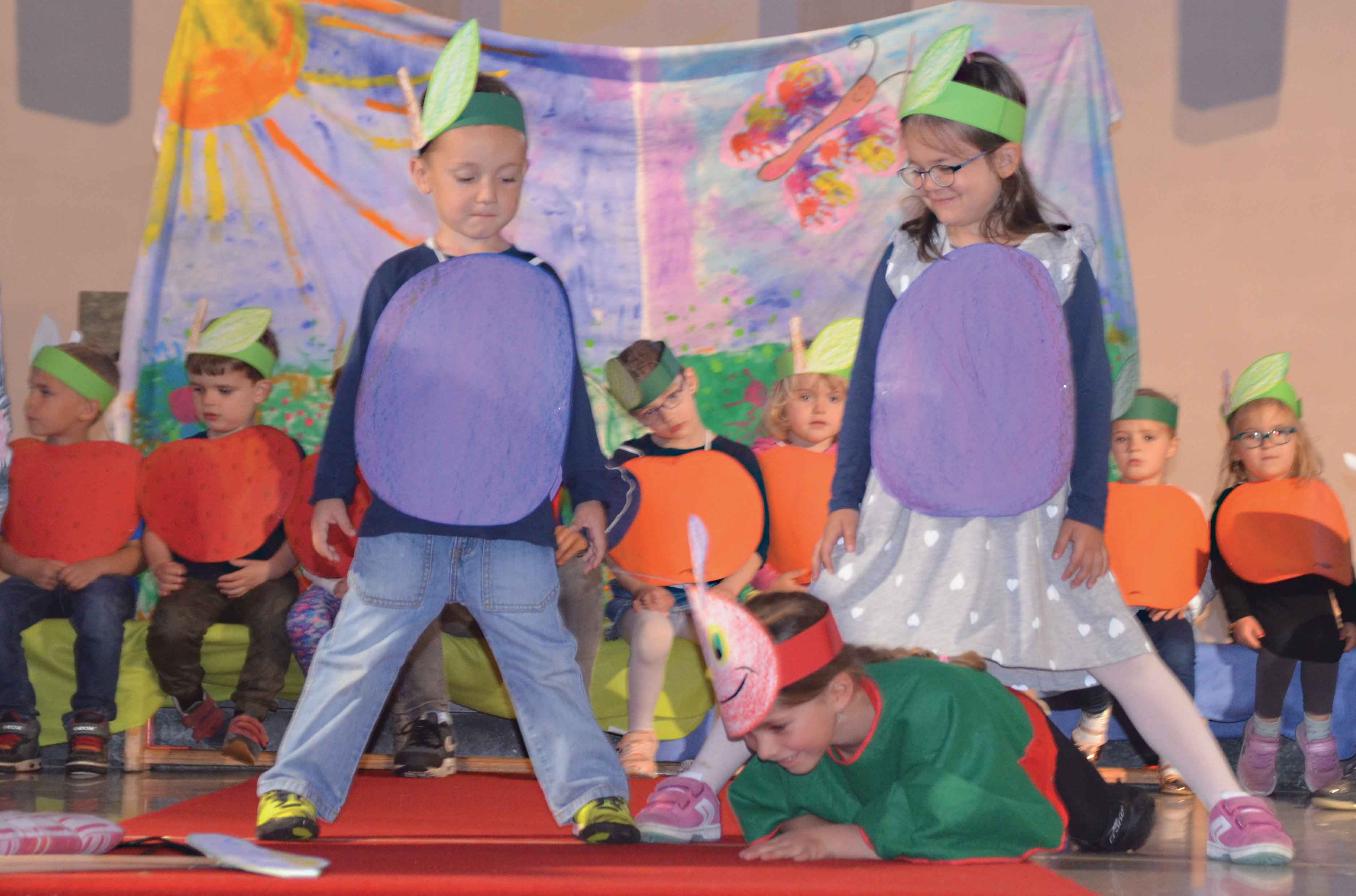 Dass die Kleinen mit ganzem Herzen bei der Sache sind, konnte man hören. Sie spielten das Theaterstück „Die kleine Raupe Nimmersatt“ und sangen dabei. Begleitet wurden sie mit Gitarren (Eltern und Erzieher) sowie Trommeln. Das Stück wurde dieses Jahr 50 Jahre alt. Die Lehre ist heute noch sehr aktuell. So lange die Raupe gesundes Obst isst, fühlt sie sich wohl; wenn sie aber Schokoladenkuchen, Eis, Waffeln und Würstchen isst, wird ihr „übel“.