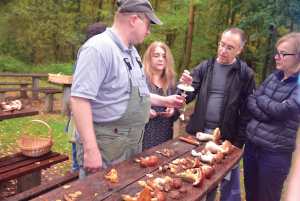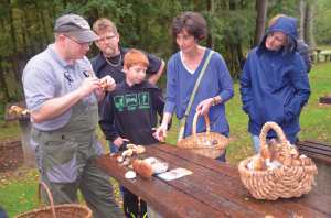Die Ausbeute war dies Jahr gut. Gegen Ende der Exkursion traf man sich auf dem Fröschenpfuhl, wo auf den Tischen jeder seine Pilze ausbreitete, so dass der Dozent die Ausbeute bestimmen konnte: Merkmale wie Farbe, Stiel, Lamellen, Geschmack und Geruch spielen dabei eine Rolle. Er trennte essbare von den giftigen Sorten und riet, das man nur junge feste Pilze nehmen sollte, „die Druckprobe“, so Theobald, „zeigt an, ob der Pilz noch genießbar ist. Bleibt die Delle, ist er zu alt“. Die Pilze, die Käfer oder Maden schon erobert haben, sollte man nicht mehr essen. Auch für die Zubereitung der Pilze gab er Tipps.