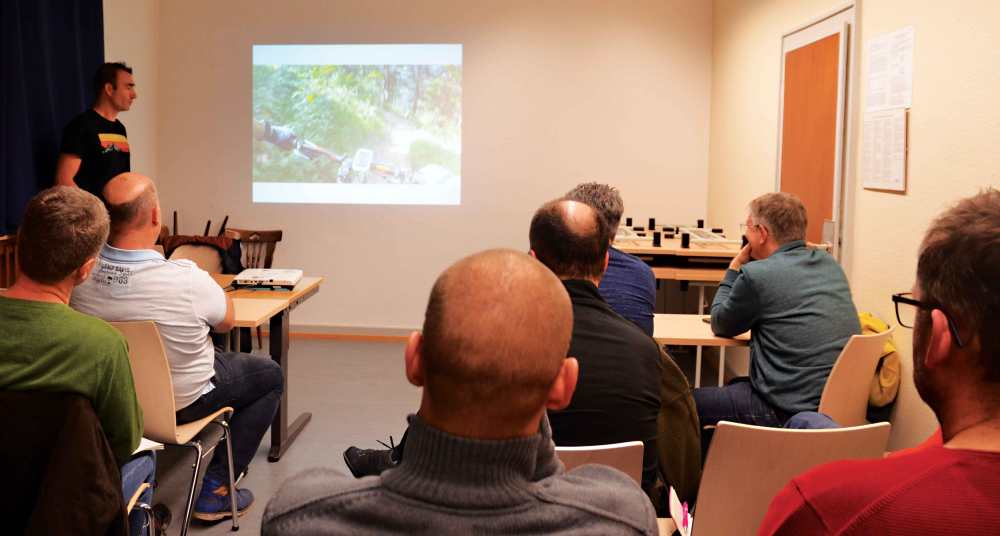 Teils unterwegs über asphaltierte Strecken, teils über Schotter, sehr lose und mit dickeren Steinen gespickt, mit starken herausragenden Wurzeln auf der Strecke, teils auf sehr schmalen Pfaden mit steilem Abgrund – das wurde so richtig deutlich, als Videosequenzen, gefilmt mit der Helmkamera gezeigt wurden. Teilweise über zehn Stunden waren die Männer und eine Frau unterwegs. Nicht nur bergauf wird den Teilnehmern alles abverlangt, sondern auch, wenn es lange Strecken bergab geht und man das richtige Bremsen kennen muss. Nicht umsonst sollte man zwei Sets Bremsbeläge mit sich führen; des Weiteren ein Kettenschloss, Seilzug, eine Spezialluftpumpe, Multitool, Ersatzspeichen, Blasenpflaster, Sonnencreme, Regen- und Windjacke. Da man manche Strecken zu Fuß überwinden, auch das Fahrrad mal tragen muss, ist das richtige Schuhwerk wichtig.