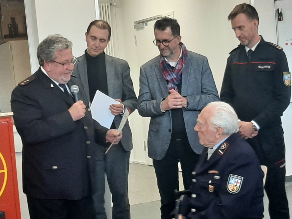 Bei der Eröffnung des neuen Feuerwehrgebäudes in Rohrbach wurde Werner Mansfeld (94) aus Hassel für 80 Jahre Feuerwehrzugehörigkeit geehrt. Unter anderem gratulierten Innenminister Reinhold Jost, Oberbürgermeister Prof. Dr. Ulli Meyer und Jochen Schneider. Werner Mansfeld galt der Respekt der gesamten Anwesenden.