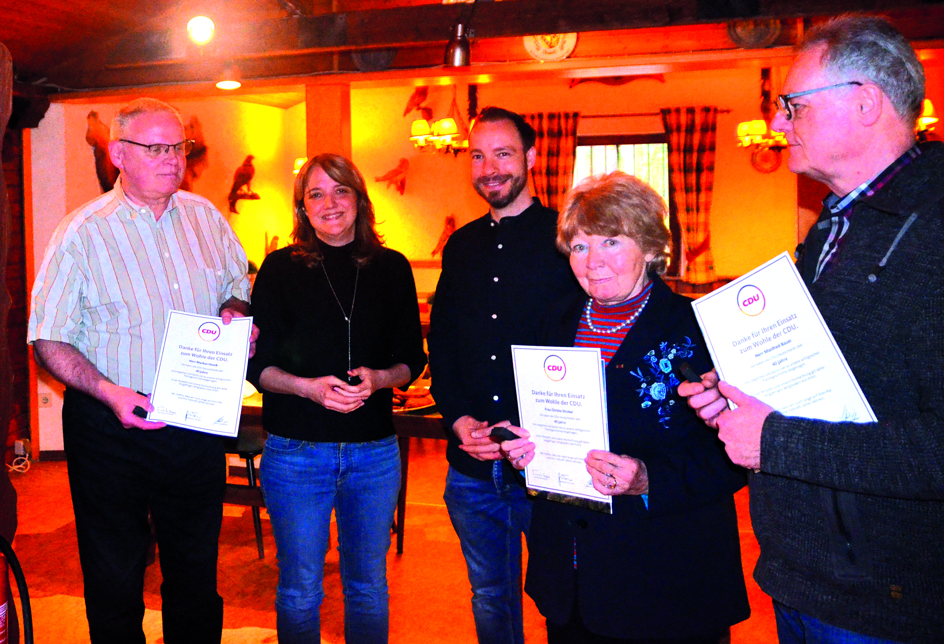 Geehrt wurden anschließend Mitglieder für 50, 40 und 25 Jahre CDU-Zugehörigkeit. Für 40 Jahre geehrt wurden Manfred Bauer, Markus Hauck, und Christa Strobel.