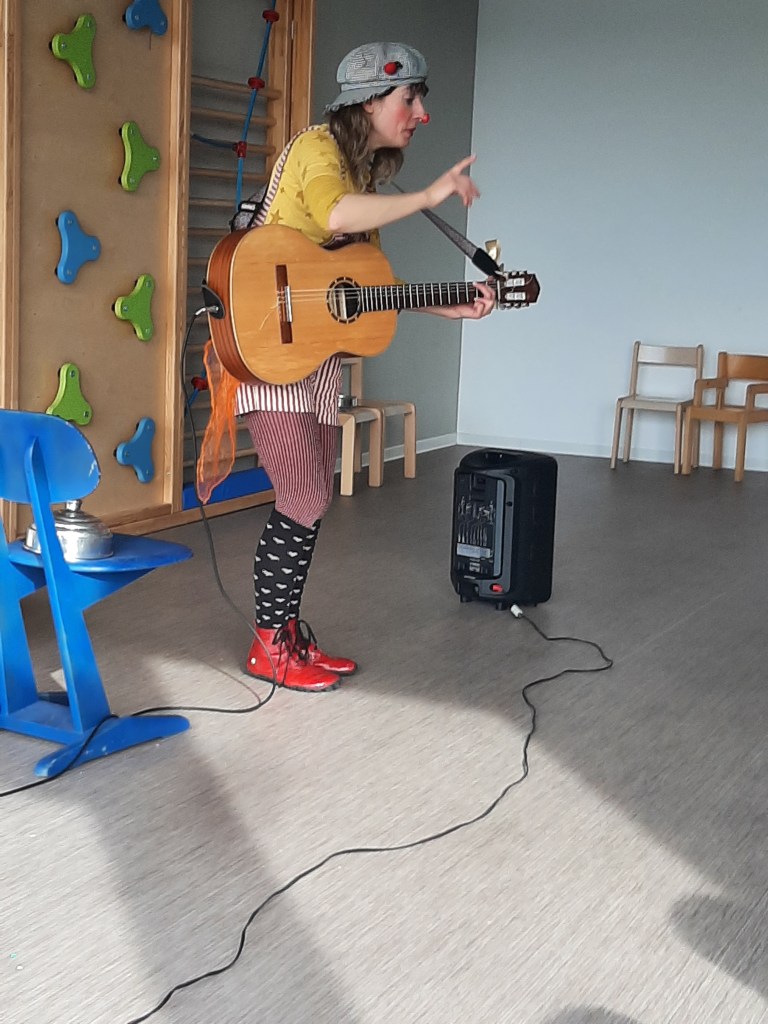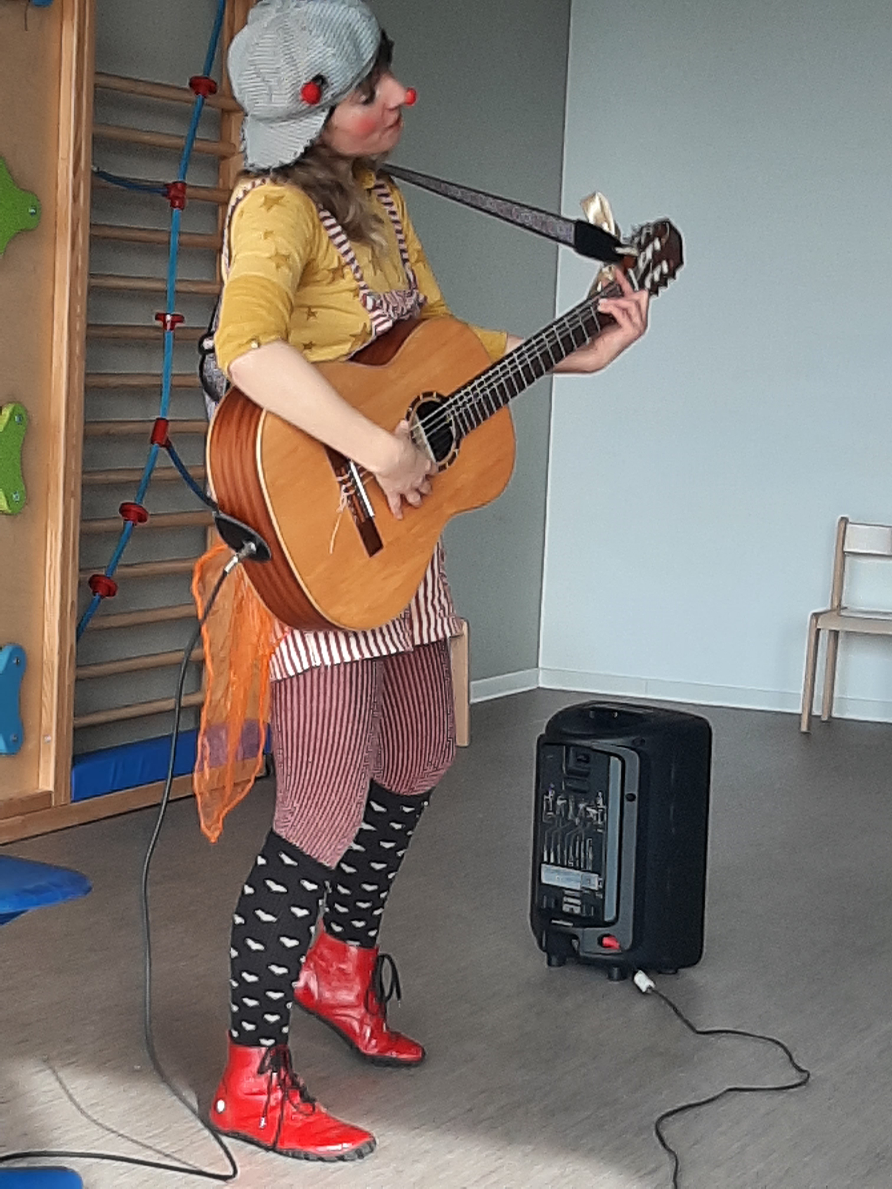Der Förderverein der Kita Herz Jesu Hassel hat erneut für alle Kitakinder, passend zur Fastnachtszeit, ein Highlight organisiert: Marie Marschall, die quirlige Clown-Schauspielerin, die verschiedene Programme zu verschiedenen Anlässen zusammengestellt hat. Sie tritt als Clownin auf, in Krankenhäusern und Kitas, um die Menschen zum Lachen zu bringen. Das gelang ihr meisterhaft in der Kita Herz Jesu Hassel, sowohl bei Kita- als auch bei Krippenkindern. Das Mitmachprogramm, die spielerische Interaktion mit Musik, elizitierte Spielfreude und kam gut an, sie hatte auch ihre Gitarre dabei und brachte die Kleinen zum Mitmachen. Mit ihrem Schirm bei bestem Wetter flog sie herein, allerdings zeigte sich der Regenschirm verquer und brachte so die Kids zum Lachen, und schon war der Bann gebrochen: ob sie vom Stuhl fiel, Purzelbäume schlug oder sich ungeschickt zeigte. Mädchen und Jungen durften Tiere raten, die sie vormachte, und sie bekamen ein großes Lob, wenn sie es richtig errieten. Ebenso machten sie begeistert beim Zaubern mit .- jedes Kind hat einen Zauberfinger -, Julia und Max durften das vorne zeigen mit Hilfe des Spruchs: „Abra-kadabra, Schwuppdiwupp Kartoffelsupp“. Auch beim Malen zauberten die Kids gemalte Tiere und Farben dazu, das glaubten sie jedenfalls. Zum Schluss wurde gekocht, dann Gummibärchen gezaubert und natürlích an alle ausgeteilt. Gut an kamen auch die Gesangseinlagen mit der Gitarre, die manche Kinder zum Tanzen animierten. Mit dem Berühren von Seifenblasen, die die Clownin überall verteilte, strömte „frische Luft“ in den Raum.