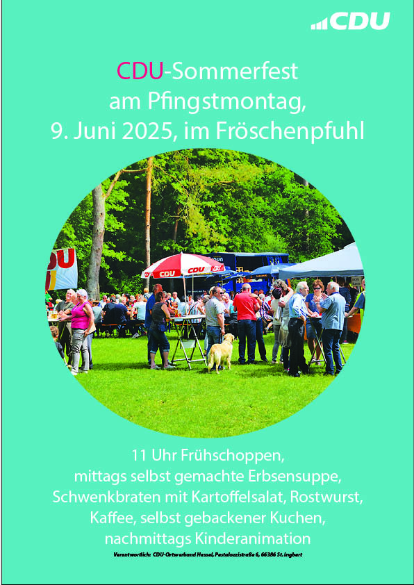 Allgemein Einladung zum Sommerfest der CDU Verfasst von Christa Strobel am 23. Mai 2025 Teilen mit: Auf Facebook teilen (Wird in neuem Fenster geöffnet) Facebook Auf WhatsApp teilen (Wird in neuem Fenster geöffnet) WhatsApp Auf X teilen (Wird in neuem Fenster geöffnet) X Einen Link per E-Mail an einen Freund senden (Wird in neuem Fenster geöffnet) E-Mail Gefällt mir Wird geladen … Ähnliche Beiträge