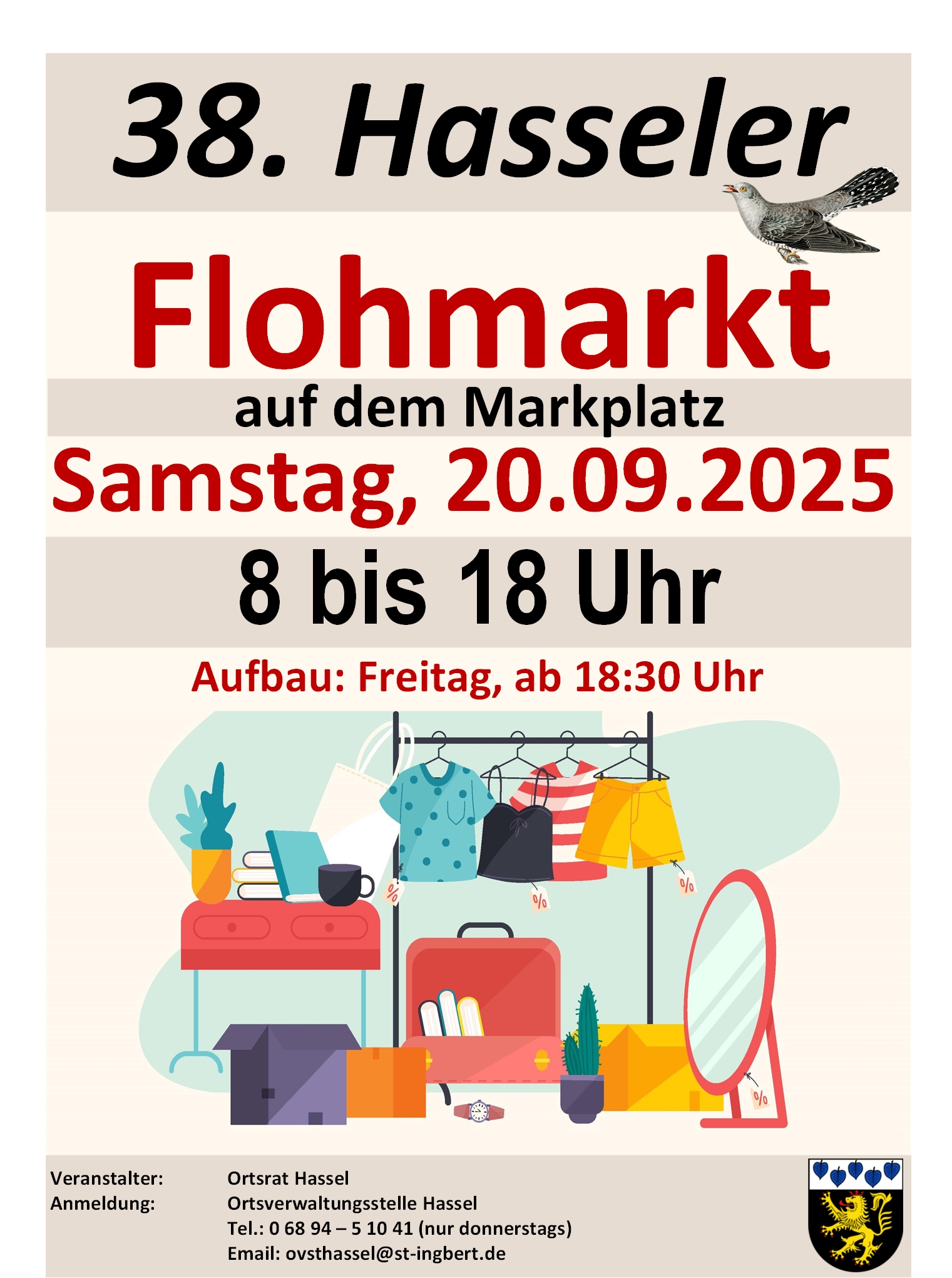 Allgemein Wieder Flohmarkt am 20.9. in Hassel Verfasst von Christa Strobel am 26. August 202526. August 2025 Anmeldung: 06894/51041 (nur donnerstags von 9-11 Uhr) oder ovsthassel@st-ingbert.de Teilen mit: Auf Facebook teilen (Wird in neuem Fenster geöffnet) Facebook Auf WhatsApp teilen (Wird in neuem Fenster geöffnet) WhatsApp Auf X teilen (Wird in neuem Fenster geöffnet) X Einen Link per E-Mail an einen Freund senden (Wird in neuem Fenster geöffnet) E-Mail Gefällt mir Wird geladen … Ähnliche Beiträge
