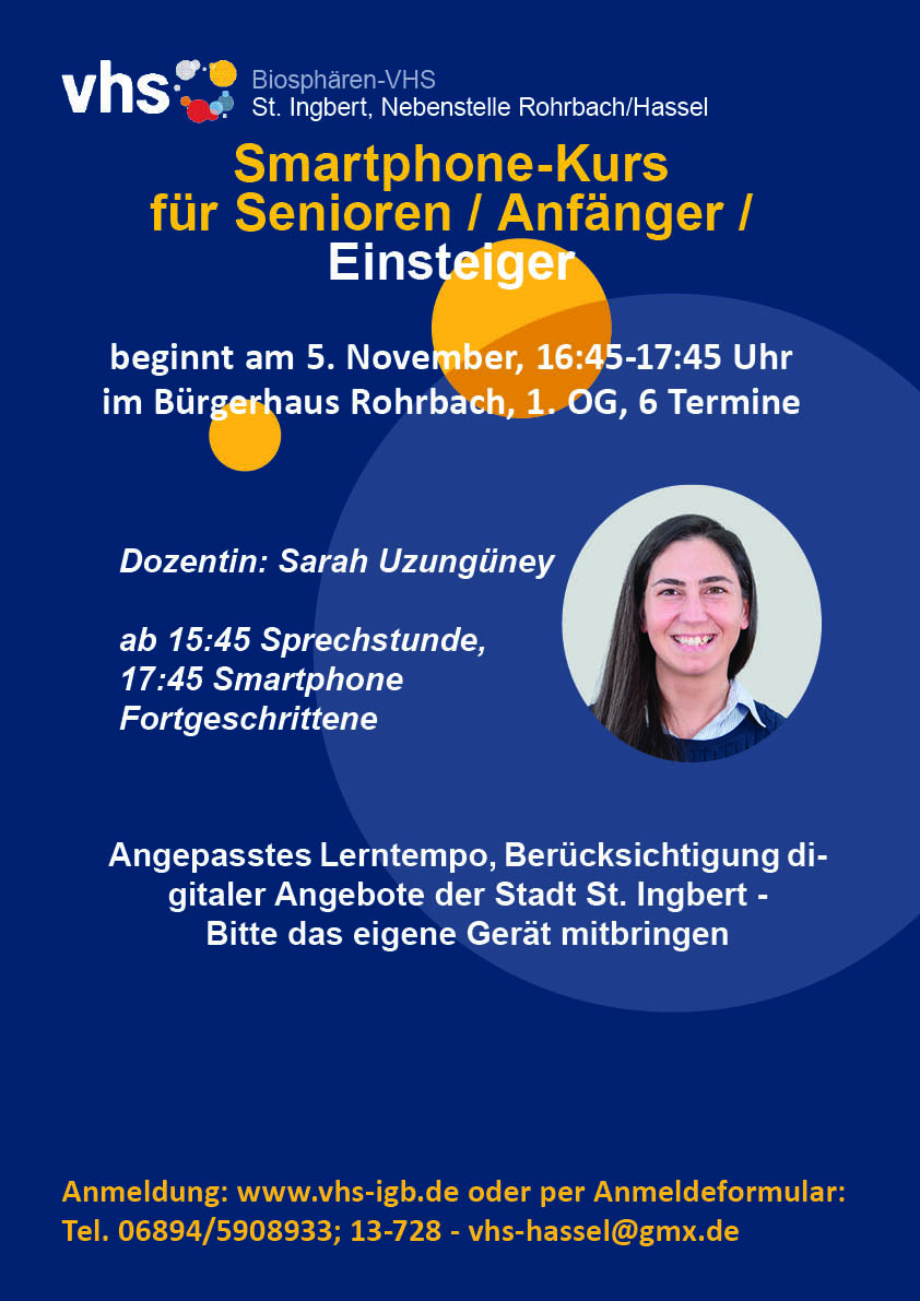 Allgemein Bald wieder Smartphonekurse für Senioren und Einsteiger Verfasst von Christa Strobel am 12. Oktober 2025 Teilen mit: Auf Facebook teilen (Wird in neuem Fenster geöffnet) Facebook Auf WhatsApp teilen (Wird in neuem Fenster geöffnet) WhatsApp Auf X teilen (Wird in neuem Fenster geöffnet) X Einen Link per E-Mail an einen Freund senden (Wird in neuem Fenster geöffnet) E-Mail Gefällt mir Wird geladen … Ähnliche Beiträge