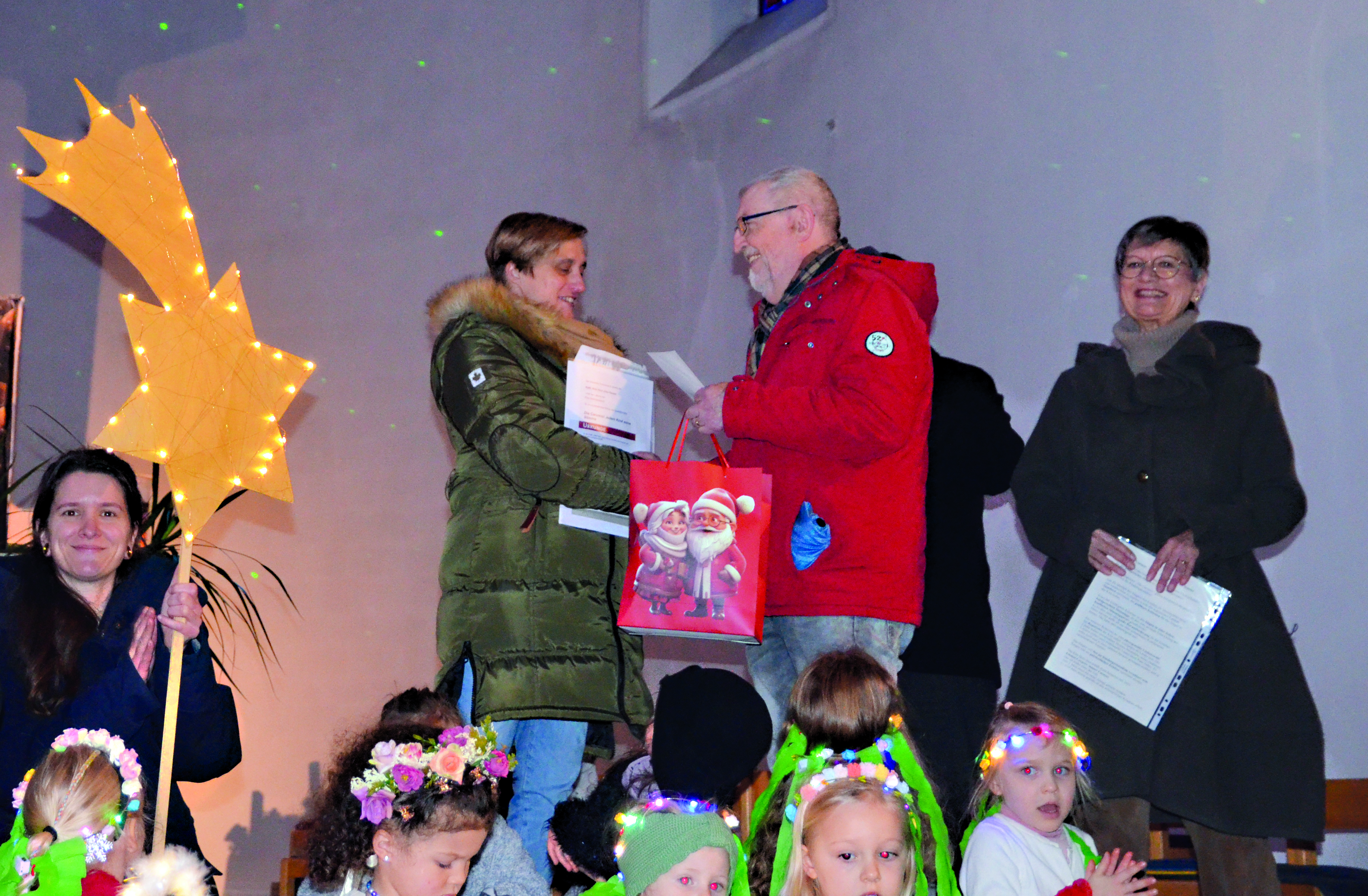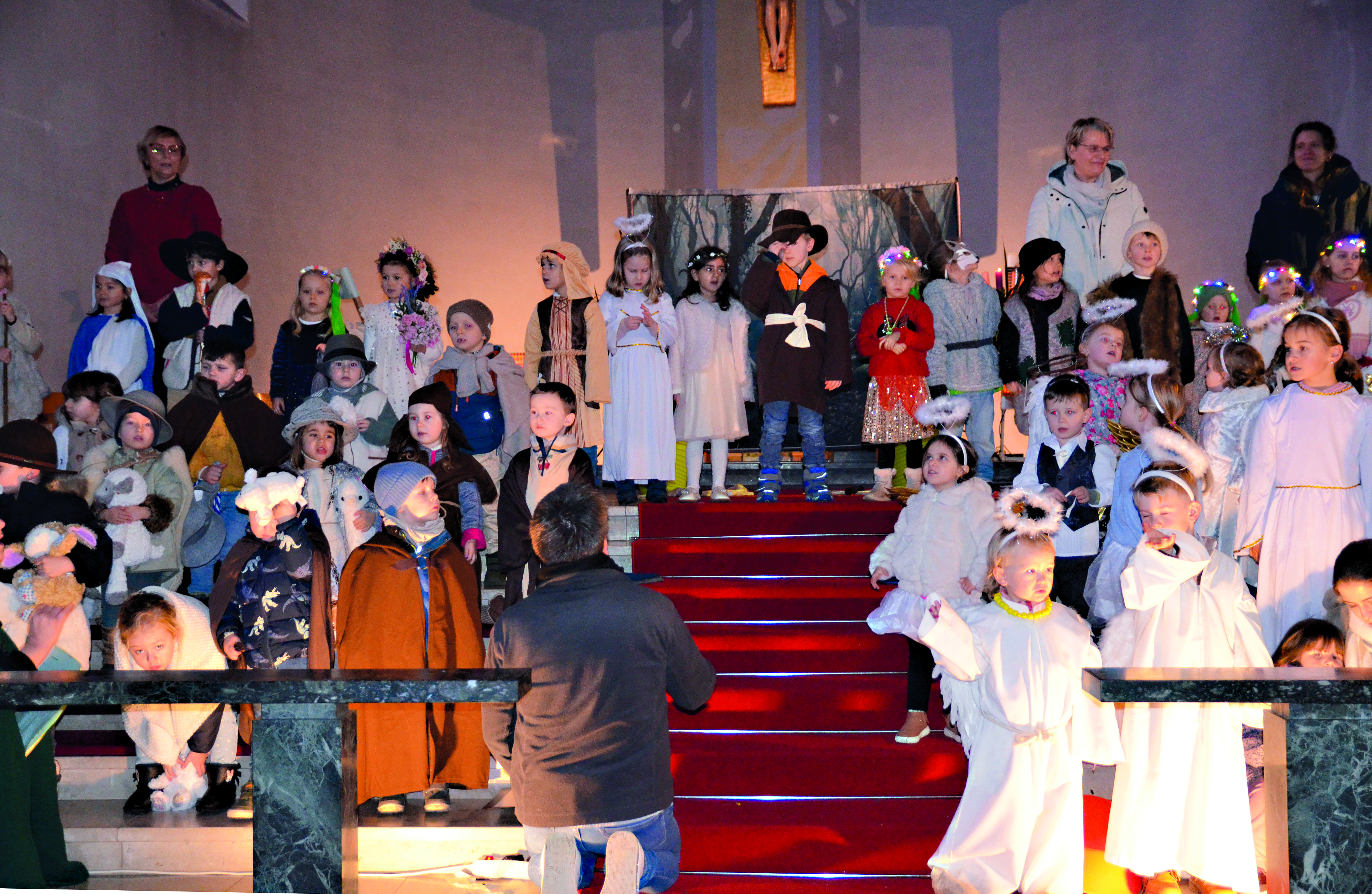 Anschließend spendierte der Förderverein der Kita in der Unterkirche einen Imbiss, bei dem sich alle einig waren, dass diese Weihnachtsgeschichte nicht nur die Kleinen, sondern auch den Großen begeistert hat. Pfarrer Alexander Klein lobte die Kitakinder für ihre Leistung, die Erzieherinnen und Erzieher für ihre Geduld beim Einüben des Stücks. Kitaleiterin Nina Rambaud stellte fest, dass die Kirche noch nie so voll war und dankte den Eltern für die fantasievollen Kostüme. Caruso-Fachberaterin Christa Gillmann hatte das Singspiel oft begleitet.