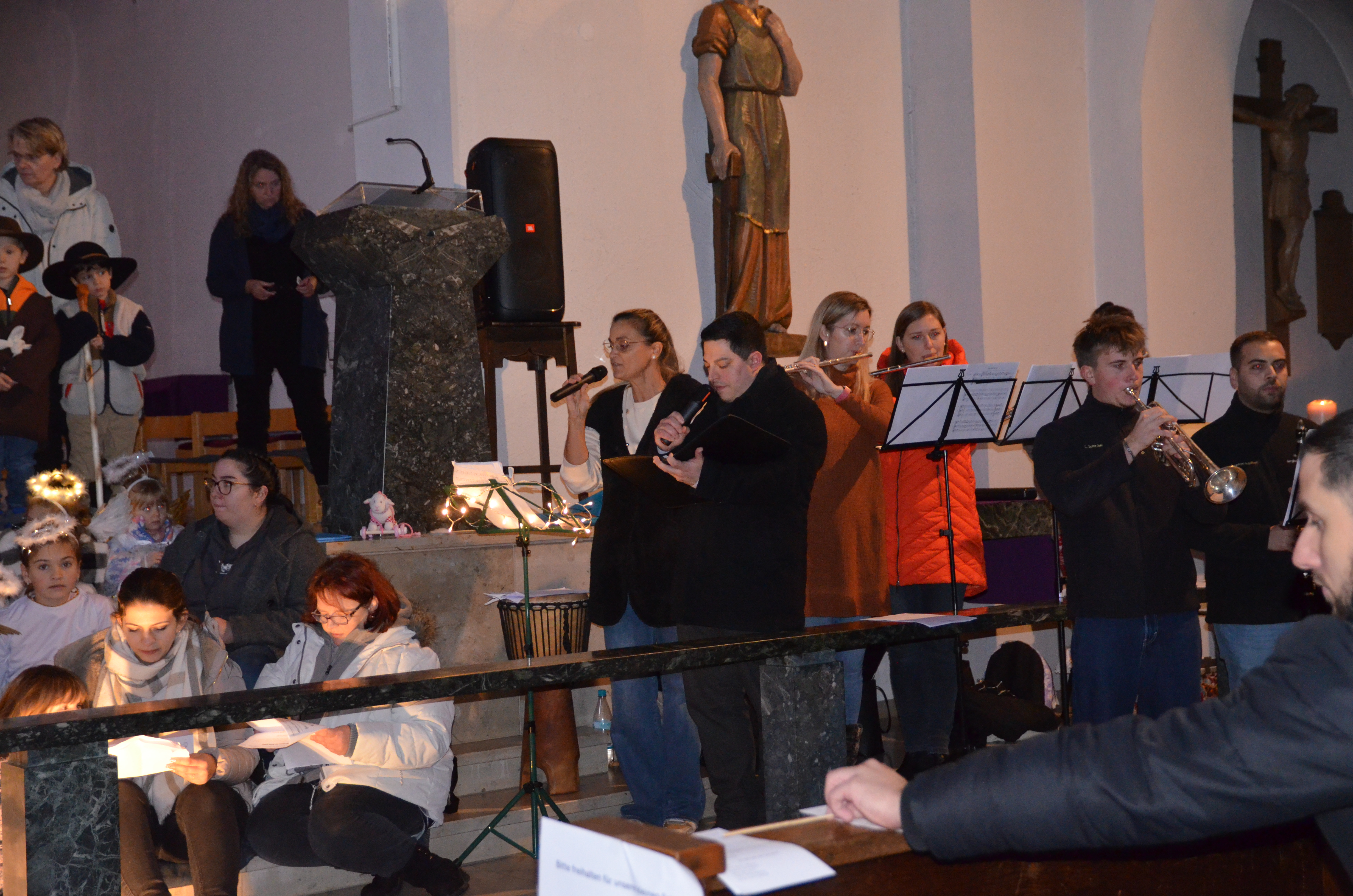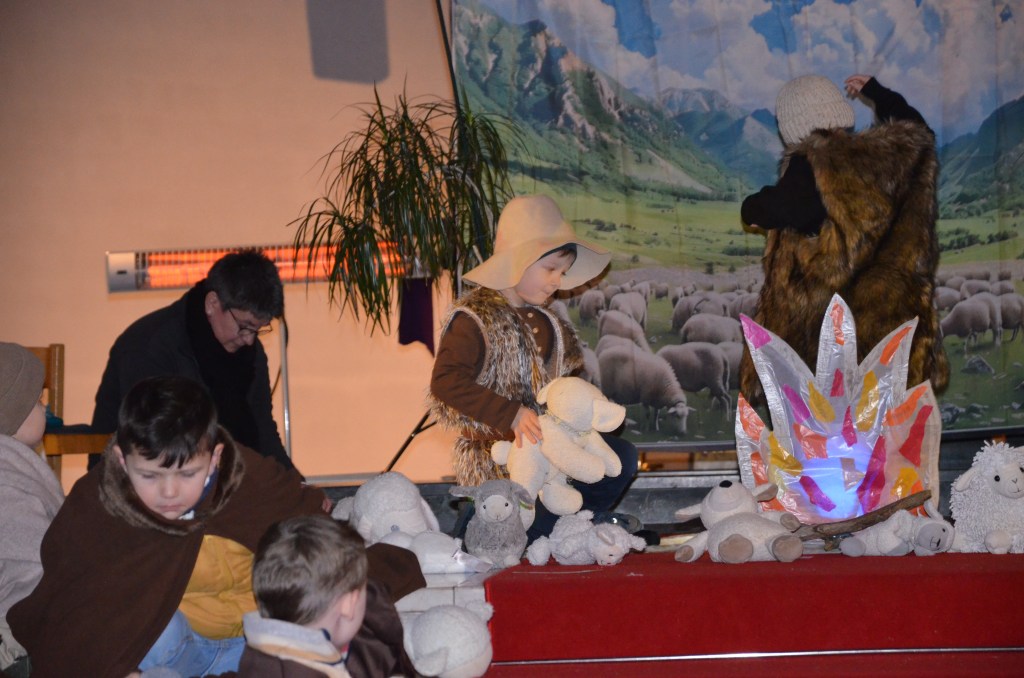 Erzählerin Heike Müller, Chorgesang (Pfarrer Alexander Klein, Erzieherinnen, Eltern Familienangehörige und Freunde) sowie Orff-Instrumentalmusik begleiteten und erschlossen neben dem darstellenden Spiel den Sinn; sogar die gesamte Kirchengemeinde sang beim Lied „Gloria“ mit. Man konnte das Leuchten in den Augen der Kinder beobachten, als sie den anwesenden Eltern, Großeltern und Verwandten ihr Singspiel präsentierten; selbst die Krippenkinder wirkten als Schafe mit. Auch die Technik und die Hilfe hinter der Bühne wurde von Eltern wie Erzieherinnen und Erziehern bewältigt.